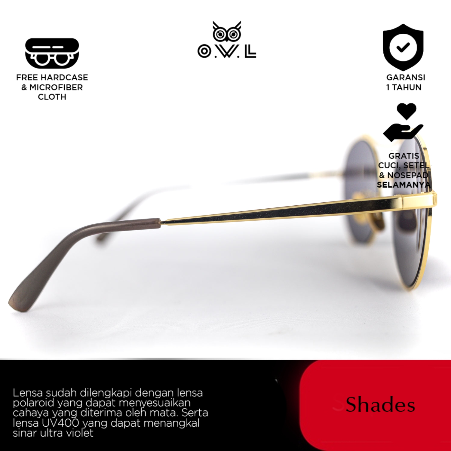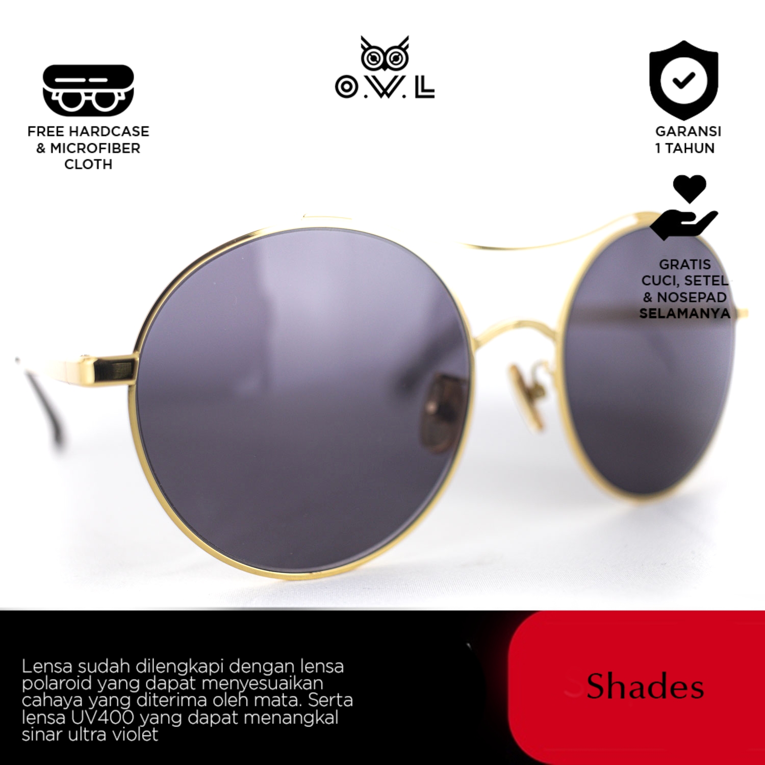 O.W.L Shades merupakan koleksi kacamata hitam atau sunglasses dengan ciri khas O.W.L yang selalu memberikan tampilan penuh gaya sekaligus melindungi dari paparan sinar matahari dilengkapi UV Protection dan Polaroid Lens.