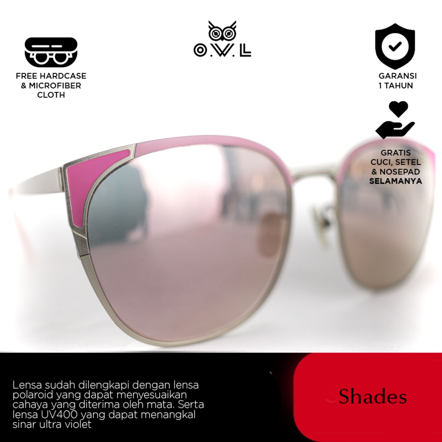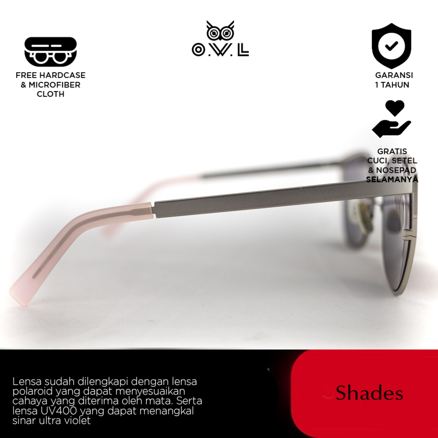 O.W.L Shades merupakan koleksi kacamata hitam atau sunglasses dengan ciri khas O.W.L yang selalu memberikan tampilan penuh gaya sekaligus melindungi dari paparan sinar matahari dilengkapi UV Protection dan Polaroid Lens.