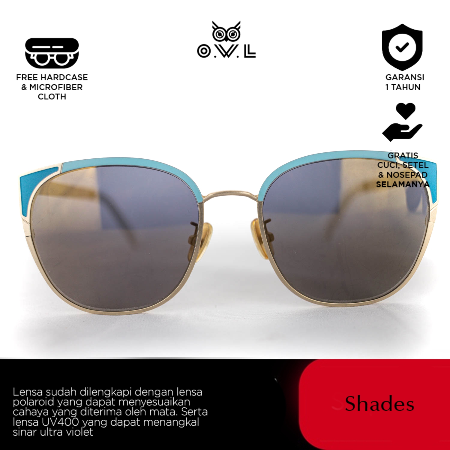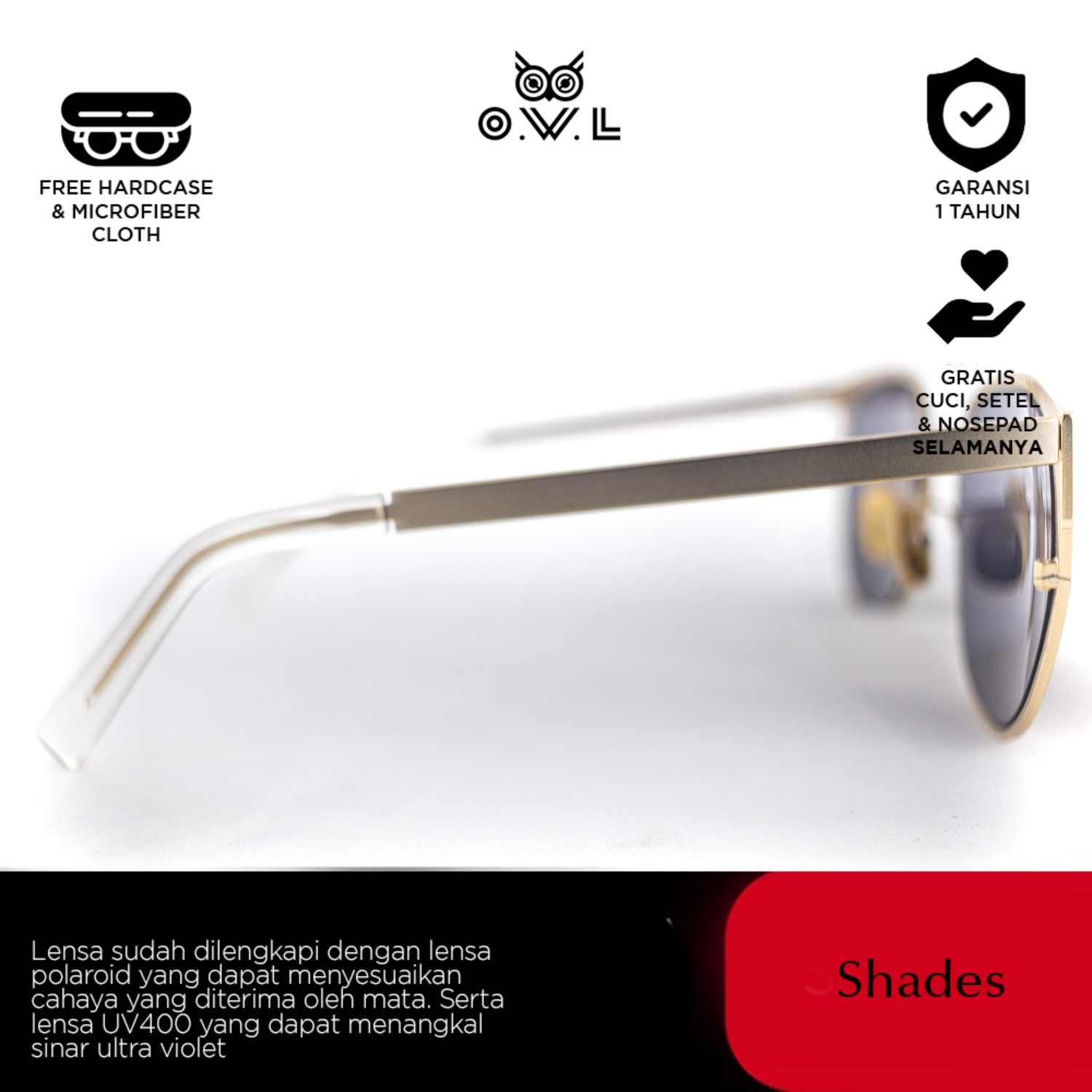 O.W.L Shades merupakan koleksi kacamata hitam atau sunglasses dengan ciri khas O.W.L yang selalu memberikan tampilan penuh gaya sekaligus melindungi dari paparan sinar matahari dilengkapi UV Protection dan Polaroid Lens.