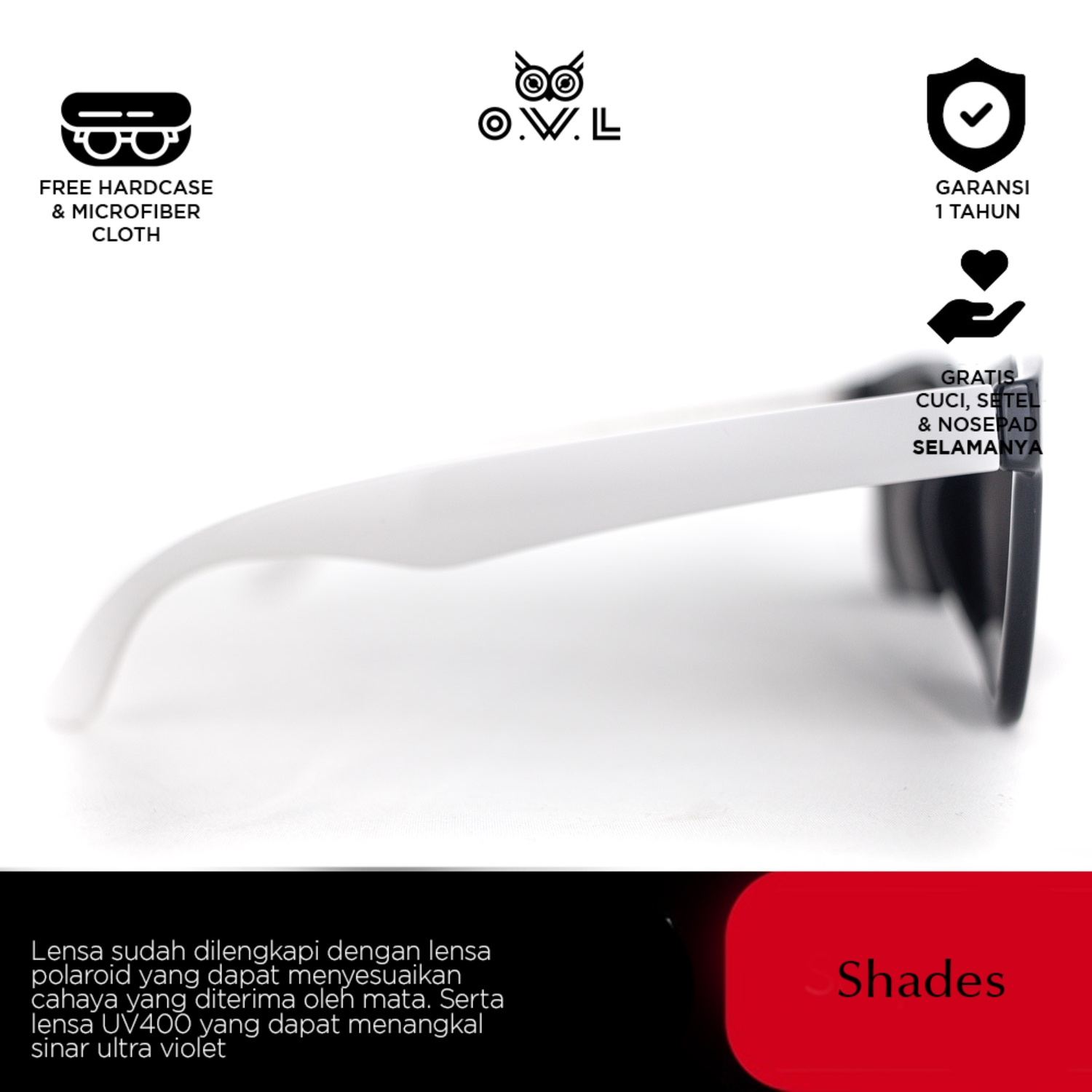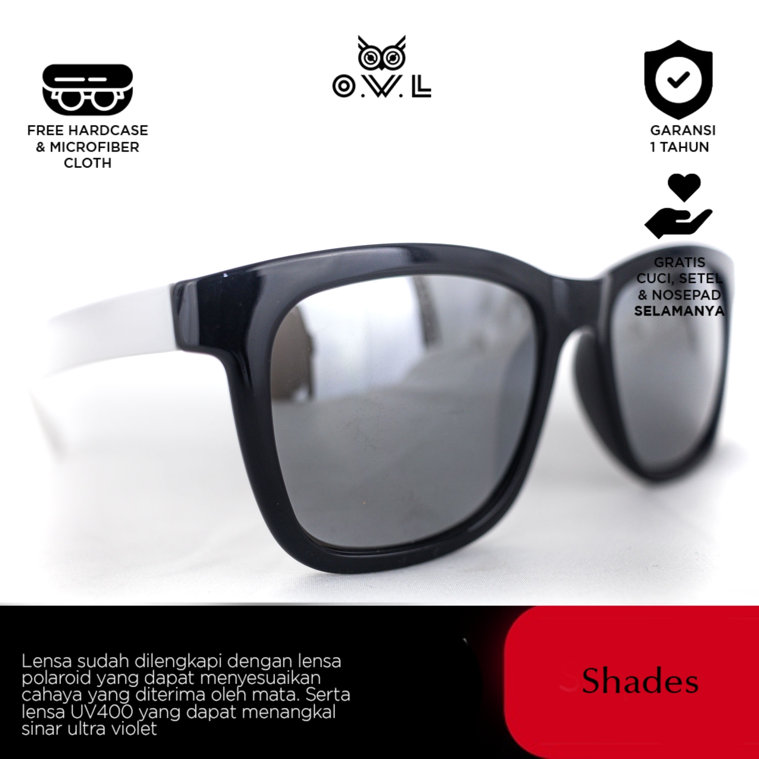 O.W.L Shades merupakan koleksi kacamata hitam atau sunglasses dengan ciri khas O.W.L yang selalu memberikan tampilan penuh gaya sekaligus melindungi dari paparan sinar matahari dilengkapi UV Protection dan Polaroid Lens.